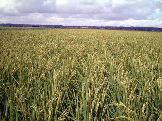 | 平成18年8月31日 稲の色が黄金色に近づいて、あともう少しで稲刈りになります。 ここまでくると台風が来ないことを祈るばかりです。 |