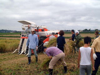 | 平成18年9月17日 稲刈りの日がやってきました。5月14日にみんなが植えた苗が大きく育ちお米になります。 大型バス2台(100人が参加)で到着、早速、着替えをしてカマの使い方を説明し稲刈り開始。 「自分で植えた所まで行きたい」 「お父さんがんばって」の声 子供たちは、イナゴ取りに夢中。 それぞれに楽しみながら稲刈り終了。刈った稲をコンバインに運び脱穀されます。 午前中一生懸命作業をしてお昼は、楽しみにしていたBBQ。みなさんお疲れさまでした。 |