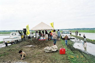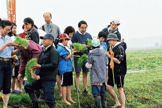 | 平成18年5月14日(日) 雨から曇り 東町自然有機農法主催による田植え祭りに東京都杉並区荻窪の森田屋米店さんのお客さん51人がやってきました。 フラワーロードに隣接する水田で行われ、田植え終了後、近くにある土地改良施設(金江津排水機場)の見学をしました。 |