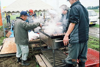 | ↑ 田植えも終わり、お昼の時間 トン汁、BBQ、おにぎり、杵と臼でついたお餅など | |